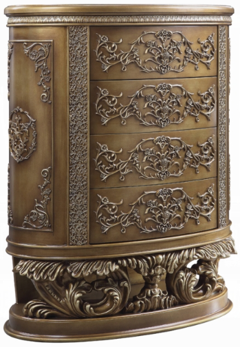 The grand Baroque style of the Constantine collection is sure to impress. With a beautiful bronze finish to emphasize the scrollwork and regal aspects of the collection. The bed features intricately carved embellishments and an oversized PU padded headboard, it is sure to be the focal point of your bedroom. The matching case goods provide style and plenty of storage with their ample drawers. Transform your bedroom into a glamorous boudoir with the Constantine collection.