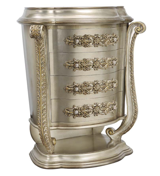 The Danae Chest exudes elegance with its champagne and gold finish. Featuring four spacious drawers and a convenient bottom shelf, it combines stylish design with functional storage, making it a perfect addition to any sophisticated space.Read More