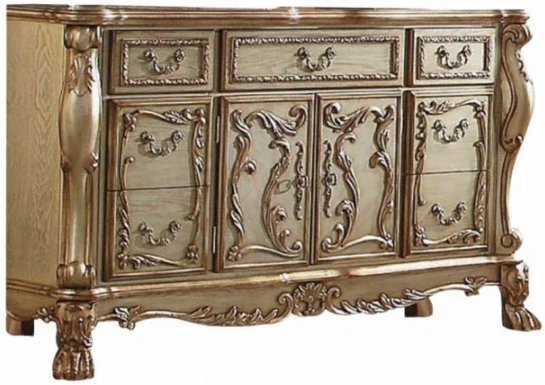 The Dresden dresser/server is a new rendition of a classic style, finished in a gold patina with a hint of gold. The antiqued look is further highlighted with hand-applied burnish. This dresser/ server features seven Felt-Lined drawers and two doors with detailed French front and back.Read More