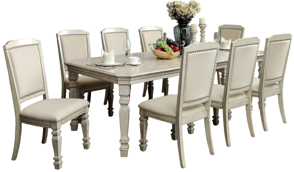 Bring elegance to the table with this fine collection of furniture! Gently turned legs add a level of sophistication to a design enhanced by the antique finish and appearance of the spacious tabletop. Padded fabric upholstery lines the backrest and seat of each coordinating chair, providing a comfortable place to sit for a full-course meal. Invite the entire family over to enjoy a lovely feast all together at one table.